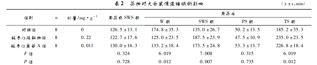 灌胃 20 d 后酸棗仁提取物組、酸棗仁皂苷 A 組體長明顯優(yōu)于 對照組,差異有統(tǒng)計學(xué)意義( P < 0. 01) ,酸棗仁提取 物組和酸棗仁皂苷 A 組比較,差異無統(tǒng)計學(xué)意義, 說明酸棗仁提取物和酸棗仁皂苷 A 都可以明顯增 加生長發(fā)育期小白鼠的體長,兩者作用相當(dāng)。見表 1。酸棗仁皂苷 A 可以促進(jìn)大白鼠慢波睡眠時間( P < 0. 05) ,酸棗 仁提取物也可以明顯促進(jìn)大白鼠慢波睡眠,與對照 組比較,差異有統(tǒng)計學(xué)意義( P < 0. 01) ,說明藥物可 以延長慢波睡眠。而兩組對異相睡眠( paradoxical sleep,PS) 期無影響。由于藥物促進(jìn)了慢波睡眠,所 以用藥組較對照組總睡眠時間明顯延長,清醒時間 減少,而酸棗仁提取物和酸棗仁皂苷 A 比較,促進(jìn) 慢波睡眠作用相當(dāng)。見表 2。