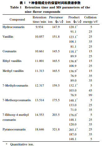 色譜柱:DB-5MS 柱(30 m × 0. 25 mm × 0. 25 μm,美國 Agilent 公司);進樣口溫度:250 ℃;進樣 方式:不分流進樣;載氣:氦氣(≥99. 999%);流量: 1. 0 mL / min。程序升溫:初始溫度 80 ℃,保持 2 min,以 10 ℃ / min 的速率升溫至 170 ℃,保 持 1 min,以 60 ℃ / min 的速率升溫至 270 ℃,保持 10 min。進樣量:1. 0 μL。 色 譜-質 譜 接 口 溫 度:280 ℃;電 子 轟 擊 電 離 (EI)源;電子能量:70 eV;多反應監測(MRM)模 式;溶劑延遲:4 min。9 種香精化合物的名稱、保留 時間和質譜參數見表 1。