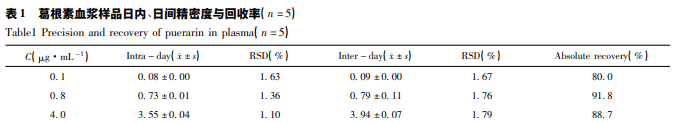 取上述對照品儲備液分別配制成 3 種質(zhì)量濃度 ( 0. 1,0. 8,4. 0 μg·mL - 1 ) 的葛根素樣品溶液,按照 “血漿預(yù)處理方法”進行處理后,分別進樣 10 μL,測 定峰面積,分別于日內(nèi)進樣 5 次,考察日內(nèi)精密度; 每 天同一時間進樣 1 次,共進樣 5 d,考察日間精密度。 另取血漿樣品,分別配制成 3 種質(zhì)量濃度( 0. 1,0. 8, 4. 0 μg·mL - 1 ) 的葛根素樣品溶液,按照“血漿預(yù)處理 方法”進行處理后,分別進樣測定峰面積,以兩者峰面 積相比,計算出葛根素在血漿提取中的絕對回收率。