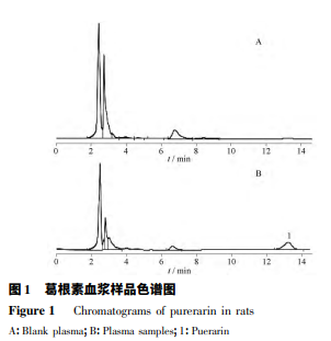 葛根素與內(nèi)標(biāo)的保留時間分別為 13. 34 和 5. 91 min,表明血漿中內(nèi)源性物質(zhì)不干擾葛根素和內(nèi)標(biāo)的 測定。結(jié)果見圖 1。