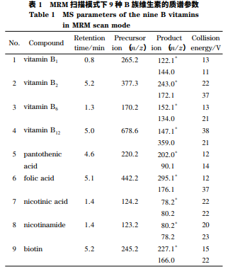 質(zhì)譜應(yīng)用技術(shù)中,流動相的選擇除考慮色譜的分離效果外還要考慮化合物的離子化程度,由于本 實(shí)驗(yàn)選用電噴霧電離源、正離子模式,所以在流動相 中添加了甲酸。此外,有機(jī)相分別采用甲醇和乙腈 進(jìn)行優(yōu)化,分析各種維生素的響應(yīng)強(qiáng)度,最終采用甲 醇作為流動相中的有機(jī)相。為了確定本實(shí)驗(yàn)的 MRM 條件,依次將單一標(biāo) 準(zhǔn)品溶液(1. 0 mg / L)不經(jīng)過色譜柱直接泵入質(zhì)譜 中,在 ESI- 模式下,大部分維生素響應(yīng)較低;在 ESI+ 模式下,9 種 B 族維生素均能獲得豐度較高的母離 子,其中鹽酸鹽、鈣鹽等都會脫去鹽后以單一分子的 狀態(tài)離子化,得到[M+H]+ 峰,維生素 B12則為多電 子物質(zhì),滿足[M+H]+ / n 規(guī)律。確定母離子后,分 別對其子離子進(jìn)行二級質(zhì)譜掃描,選擇豐度較高、干 擾較小的兩對子離子作為定性離子,豐度最高的離 子作為定量離子,然后優(yōu)化其碰撞能量。用 0. 1% (v / v)甲酸水溶液配制標(biāo)準(zhǔn)溶液,以各 B 族維生素的峰面積為縱坐標(biāo)(y)、質(zhì)量濃度為橫 坐標(biāo)(x,μg / L)繪制標(biāo)準(zhǔn)曲線。結(jié)果表明,9 種維 生素均具有良好的線性關(guān)系,相關(guān)系數(shù)(R2 )均大于 0. 999。以信噪比為 3 和 10 時的進(jìn)樣濃度為最低檢 出含量和最低定量含量,根據(jù)樣品前處理過程,最終 計算得出該方法的檢出限為 0. 09~1. 67 μg / L。